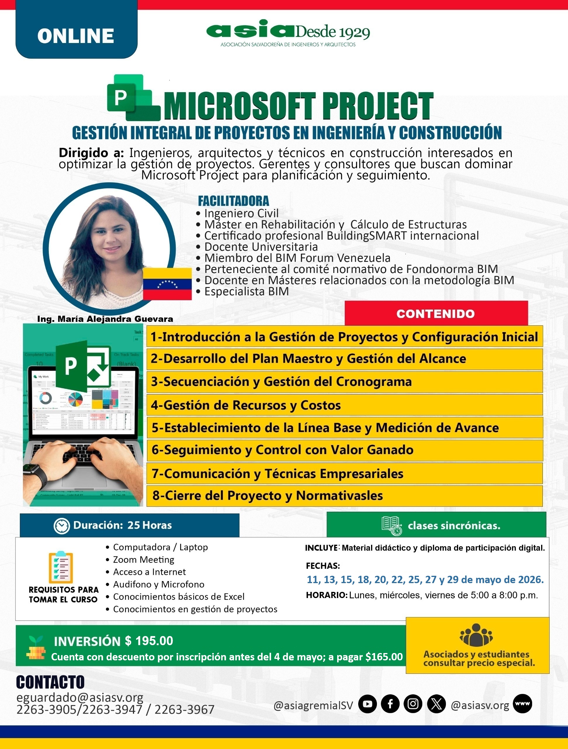 mayo- Microsoft project. Gestión integral de proyectos en ingeniería y construcción por Educación Continua | Mar 27, 2026 Current Status Not Enrolled Price $165.00 Get Started Take this Course Cuenta con descuento por inscripción ante del 4 de mayo, a pagar $165.00 Pago con tarjeta, enlace: https://lk.wompi.sv/Ldzd *Transferencia a la cuenta No.: 503-040-851-0 Banco agrícola Cuenta corriente / A nombre de ASIA. Completar ficha de inscripción: https://cencasia.edu.sv/ficha-de-inscripcion-asia/