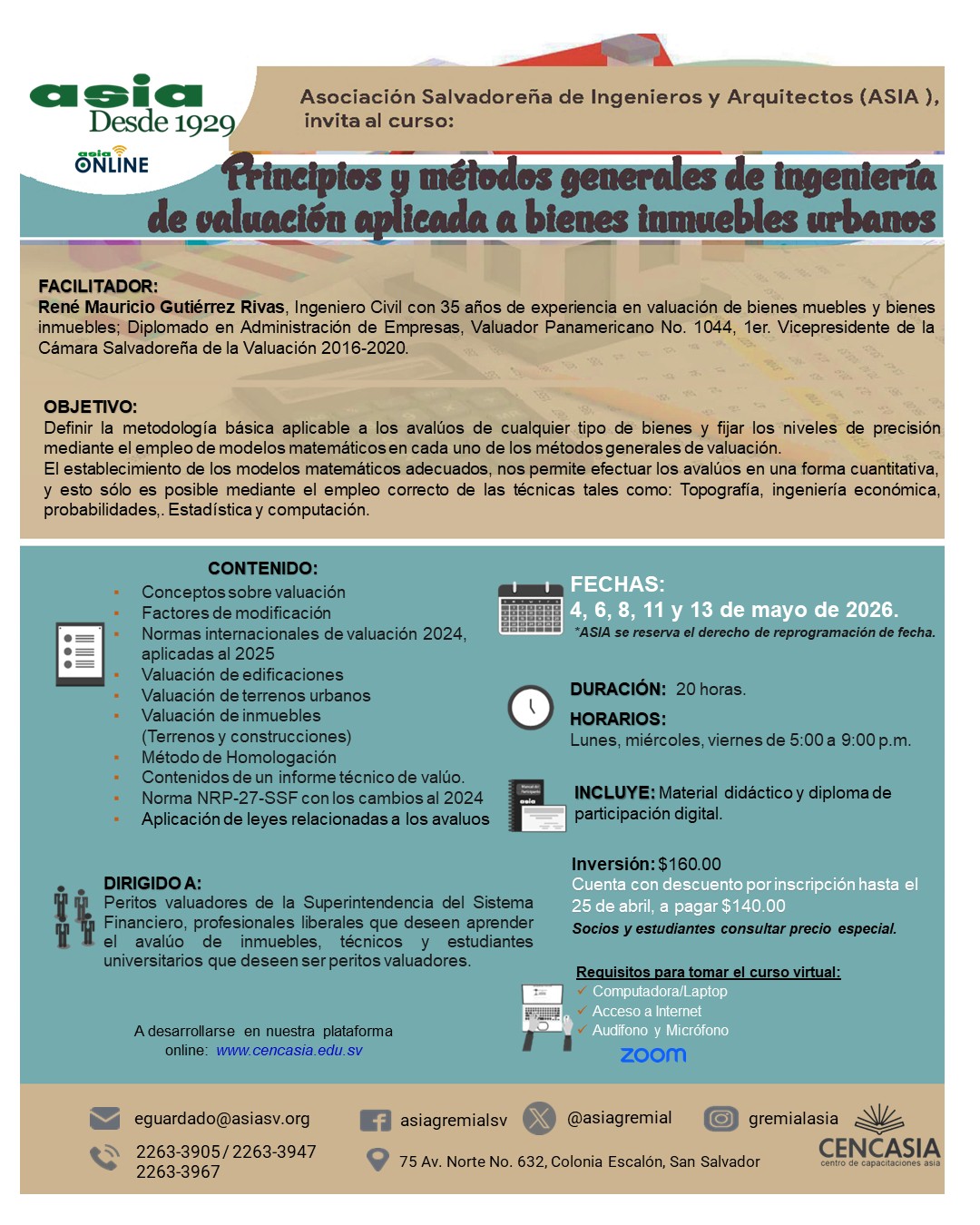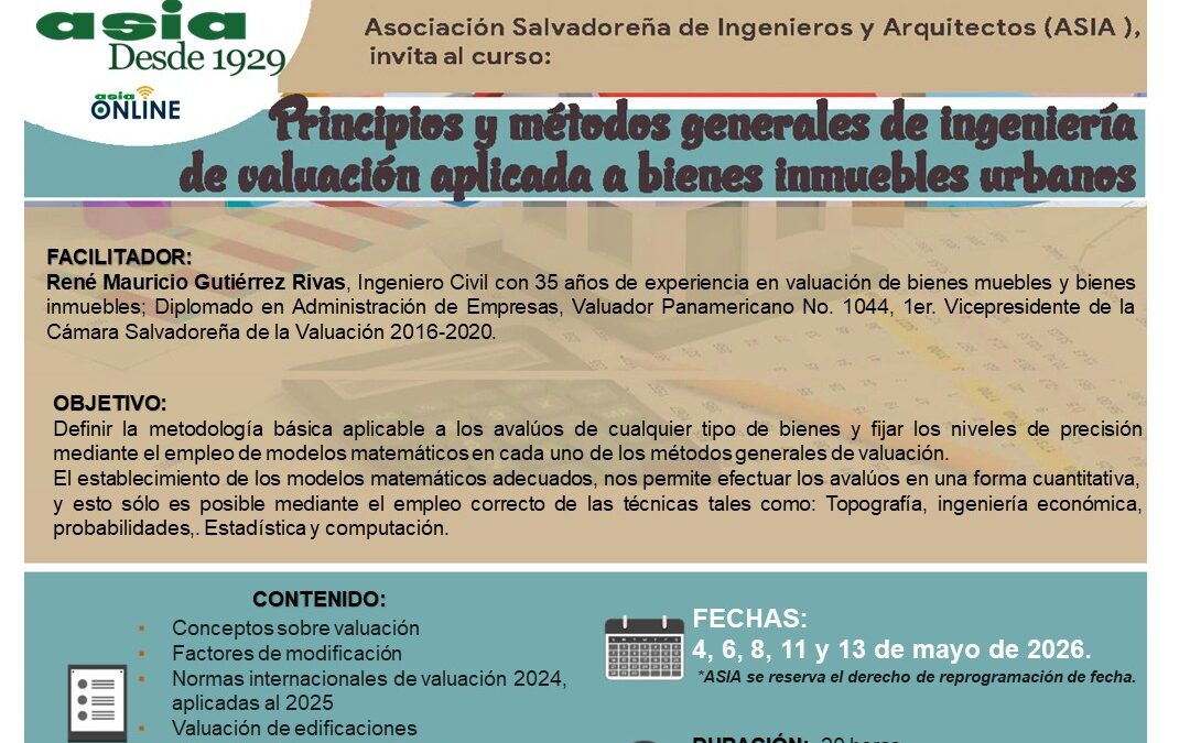 Principios y métodos generales de ingeniería de valuación aplicada a bienes inmuebles urbanos por Educación Continua | Mar 3, 2026 Current Status Not Enrolled Price $ 140.00 Get Started Take this Course Cuenta con descuento por inscripción hasta el 25 de abril, a pagar $140.00 Pago con tarjeta, enlace: https://lk.wompi.sv/Ldzd *Transferencia a la cuenta No.: 503-040-851-0 Banco agrícola Cuenta corriente / A nombre de ASIA. Completar ficha de inscripción: https://cencasia.edu.sv/ficha-de-inscripcion-asia/